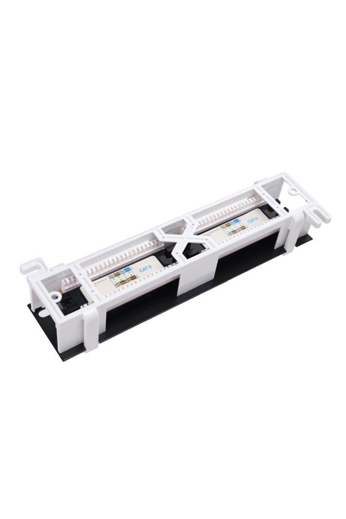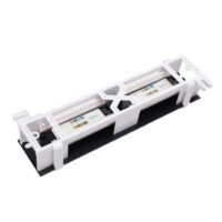 5e ir 6 kategorijos 12 portų komutacinė – patch panelė, skirta montuoti į 10″ rėmą, arba prie sienos, montažinės plokštes, ar kitos plokštumos.