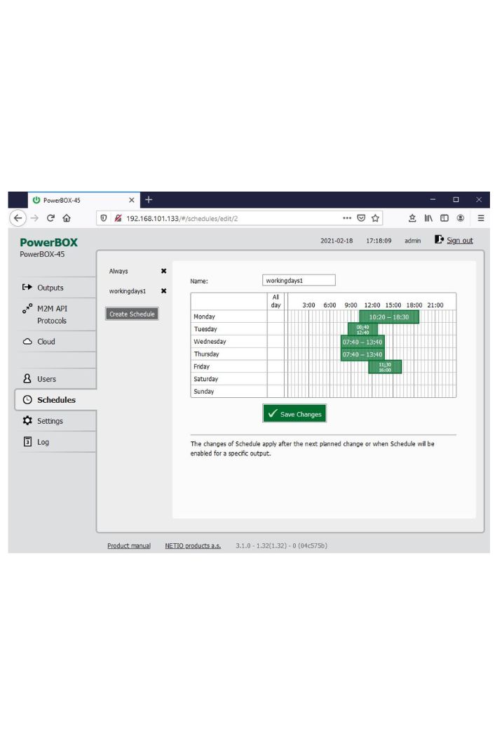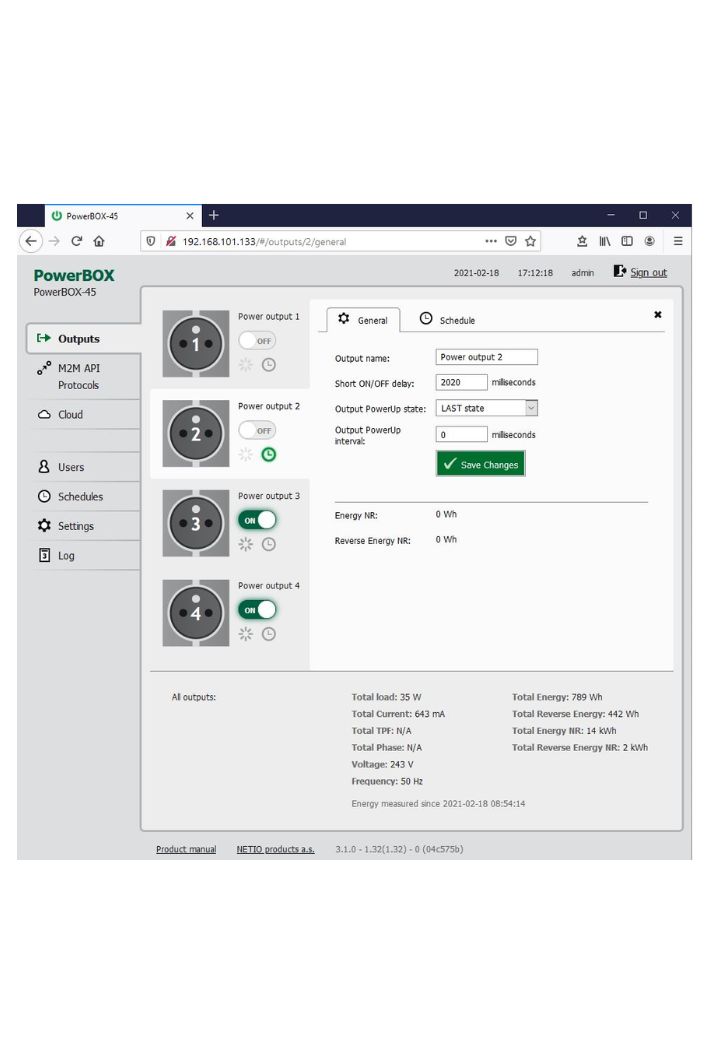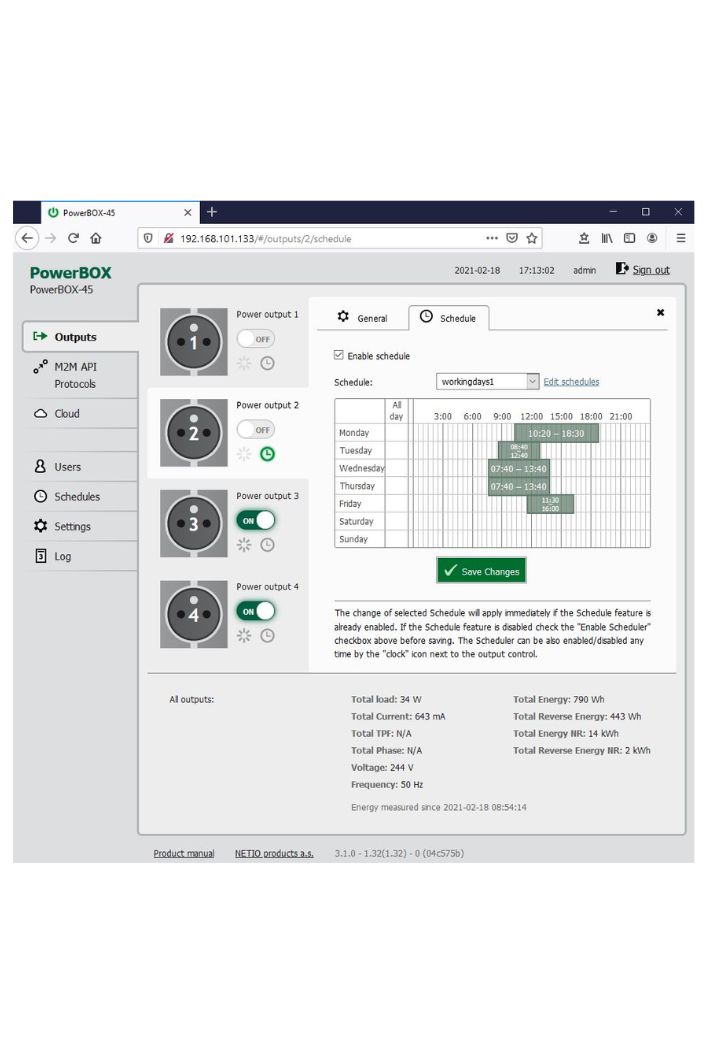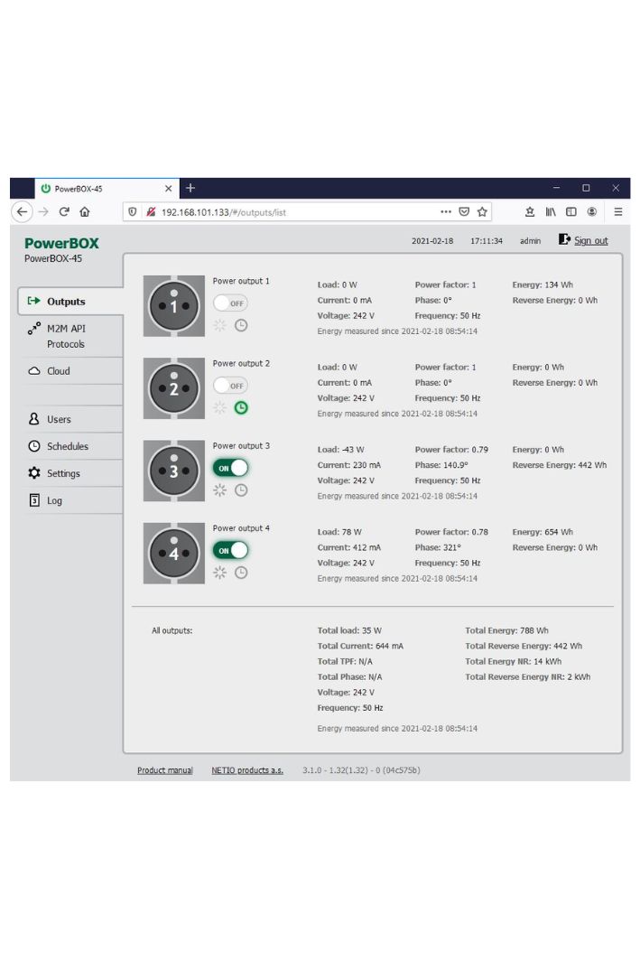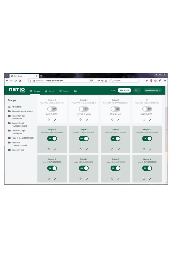 NETIO PowerBOX 4KF galima konfigūruoti naudojant žiniatinklio naršyklę (išėjimo valdymas, matavimai, laikmačio nustatymai ir kt.). Atskirus išėjimus taip pat galima valdyti naudojant „NETIO Cloud“ paslaugą, mobiliąją programėlę arba atvirąją API sąsają (http JSON/XML, SNMP, Modbus/TCP, Telnet, MQTT ir kt.).